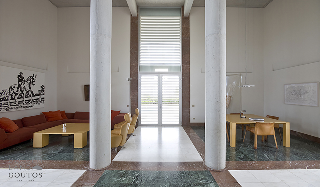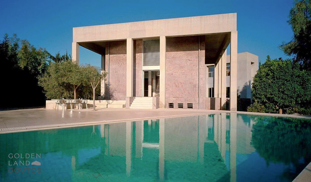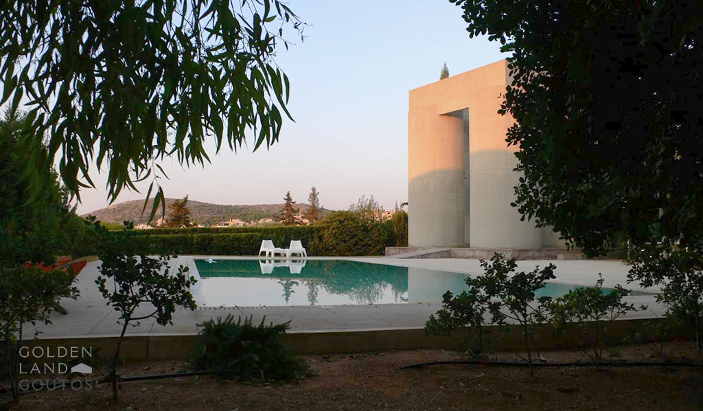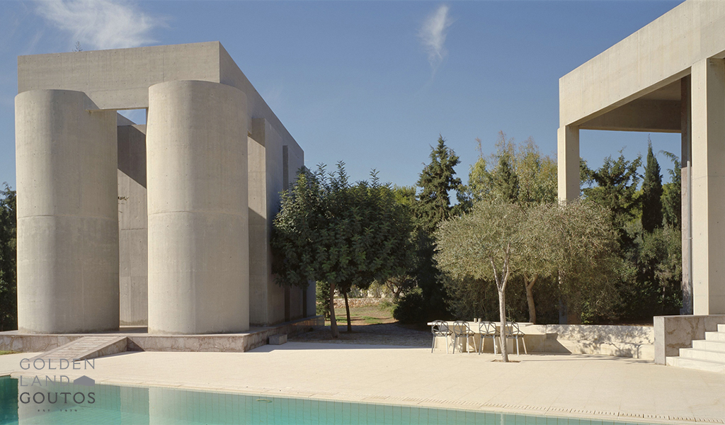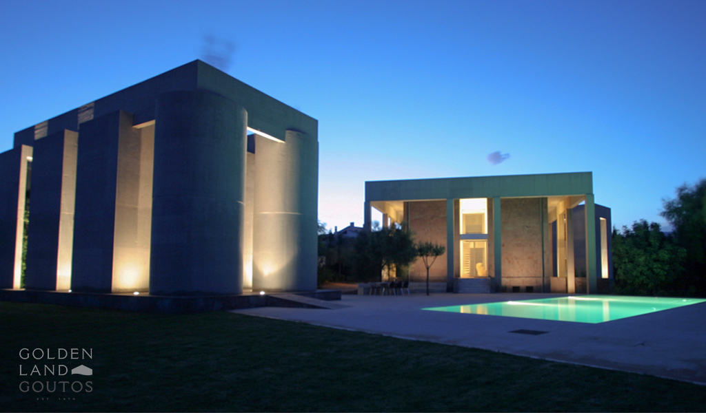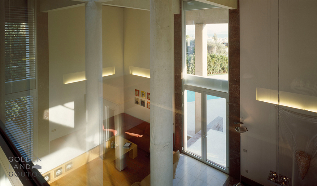 The house is analyzed into three buildings, each one of them having a different function. A central building houses the common use spaces (sitting room, kitchen, dining-room, library); to the north, a building contains the bedrooms; to the south, the guest-house. The breaking-down of the house confers increased importance to the exterior spaces of stay and movement, which become in this way a composing element of the residence. The building complex is inspired by the idea of a private residence using proportions and materials that belong to the vocabulary of the public, monumental architecture. The assignment of the different functions to specific building structures gives to the house functional and morphological clarity. At a purely functional level, this breaking-down allows for a better isolation of the different activities and it protects the privacy of the residents. The disposition of the buildings with the entrance reflects the function and importance of each one of them. The positioning of the buildings at different angles defines multiple visual trajectories. Moreover, the angles created by the axes of the buildings emphasize the perspective of the intervening spaces. The symmetry of the structures and the morphological independence of the buildings enhance these phenomena.