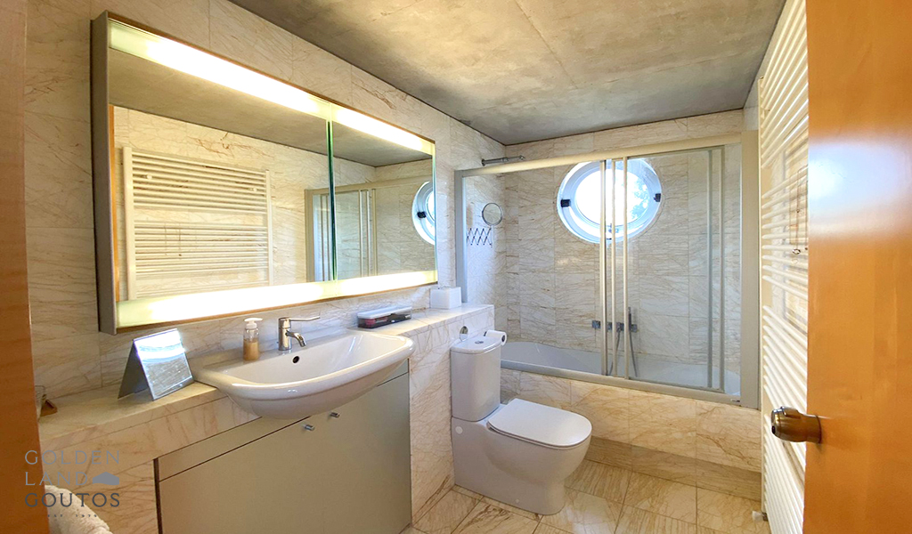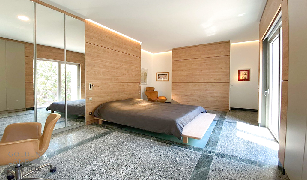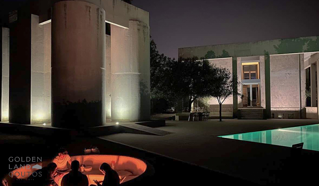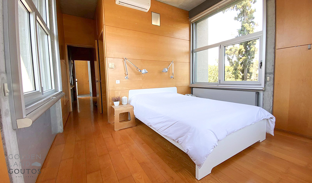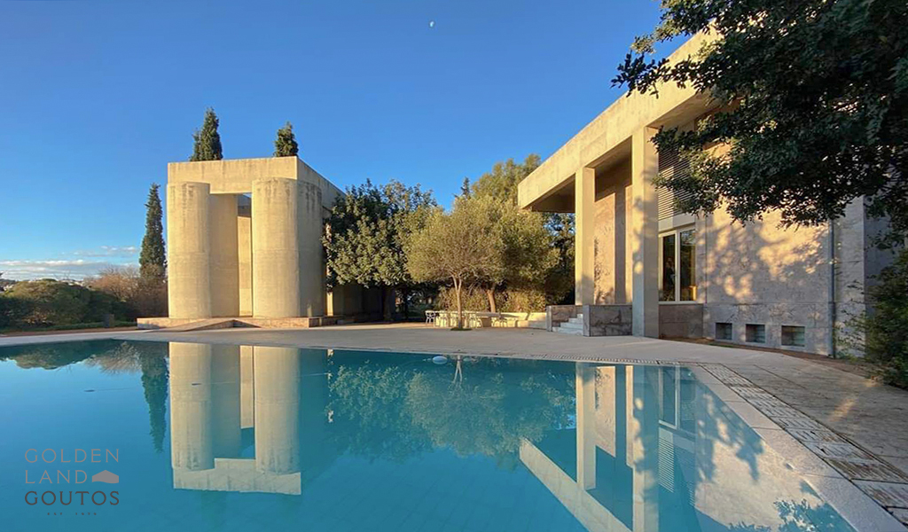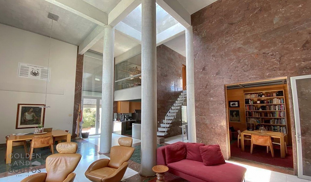 The house is analyzed into three buildings, each one of them having a different function. A central building houses the common use spaces (sitting room, kitchen, dining-room, library); to the north, a building contains the bedrooms; to the south, the guest-house. The breaking-down of the house confers increased importance to the exterior spaces of stay and movement, which become in this way a composing element of the residence. The building complex is inspired by the idea of a private residence using proportions and materials that belong to the vocabulary of the public, monumental architecture. The assignment of the different functions to specific building structures gives to the house functional and morphological clarity. At a purely functional level, this breaking-down allows for a better isolation of the different activities and it protects the privacy of the residents. The disposition of the buildings with the entrance reflects the function and importance of each one of them. The positioning of the buildings at different angles defines multiple visual trajectories. Moreover, the angles created by the axes of the buildings emphasize the perspective of the intervening spaces. The symmetry of the structures and the morphological independence of the buildings enhance these phenomena.
