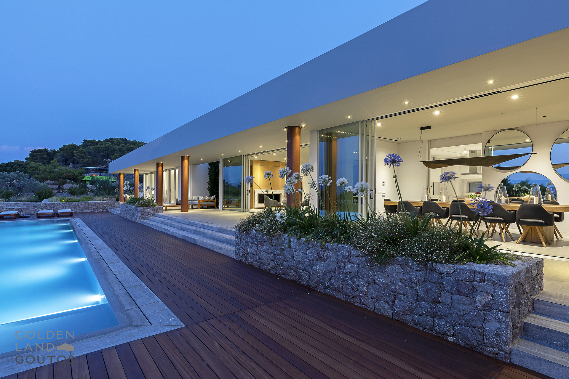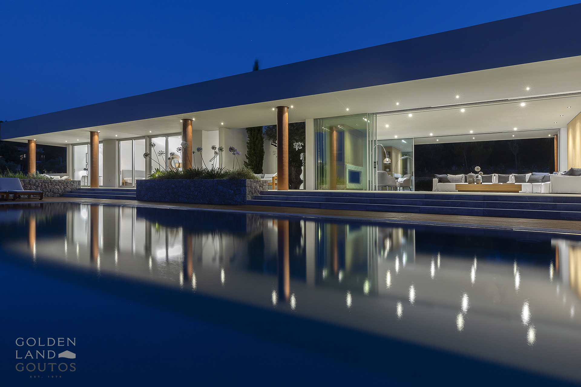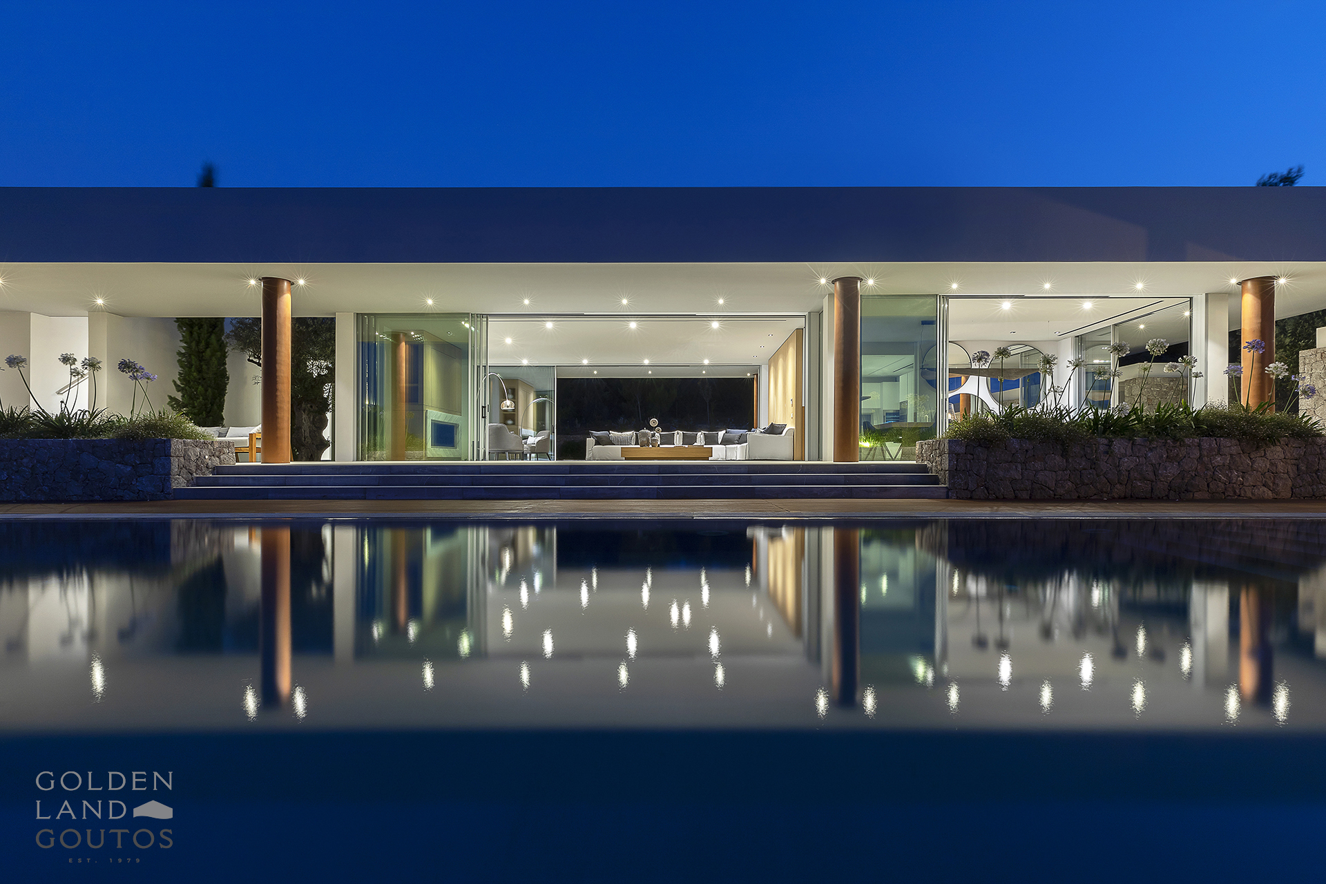 Villa Eternity allows guests to sink into luxury living. This new 750 sqm villa, boasting a 50-meter façade facing the sea, is situated on an 8,000 sqm plot granting exclusive access to three private small coves. This beautifully decorated estate is fully furnished and equipped to accommodate up to 14 guests. Given its unique architectural design and its exceptional sea view, Villa Eternity is designed to complement our visitor’s inner sense of relaxation and privacy. Both interior and exterior areas, along with an infinity-style pool at the front of the property, guarantee its visitors comfort and luxury.