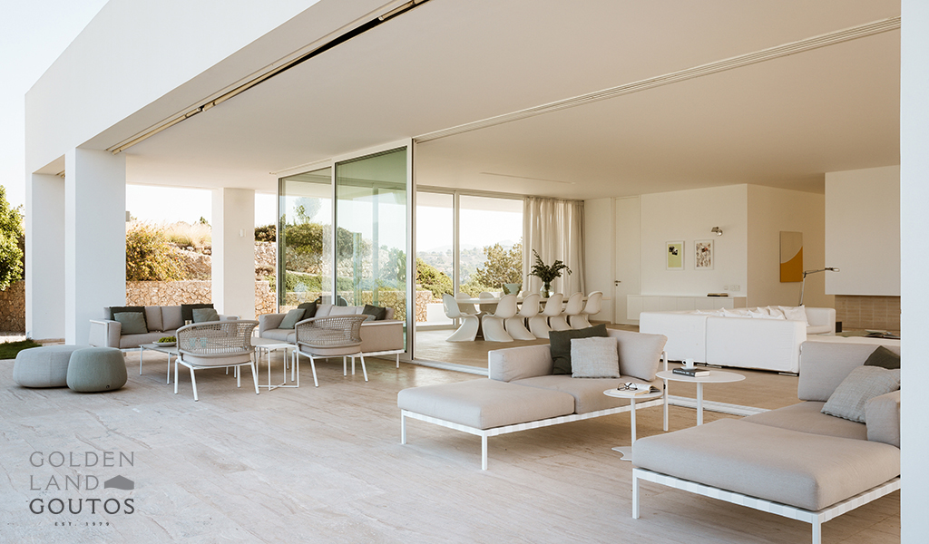 A breathtaking open plan living space is elevated to create the prime public space overlooking the swimming pool and the sea. Glass sliding panels separate the internal from the external areas creating a unified space, enjoying 180 degrees of unobstructed sea views and the magnificent sunset.